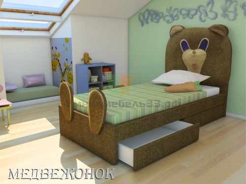 Детская кровать Медвежонок с отделкой мягкими мебельными тканями. Кровать изготавливается из ткани "Невада" (как на фото). В других тканях модель не изготавливается. Возможна установка ортопедического основания и подъёмного механизма или выкатных ящиков. Дополнительные бортики +2300 руб (смотрите фото)